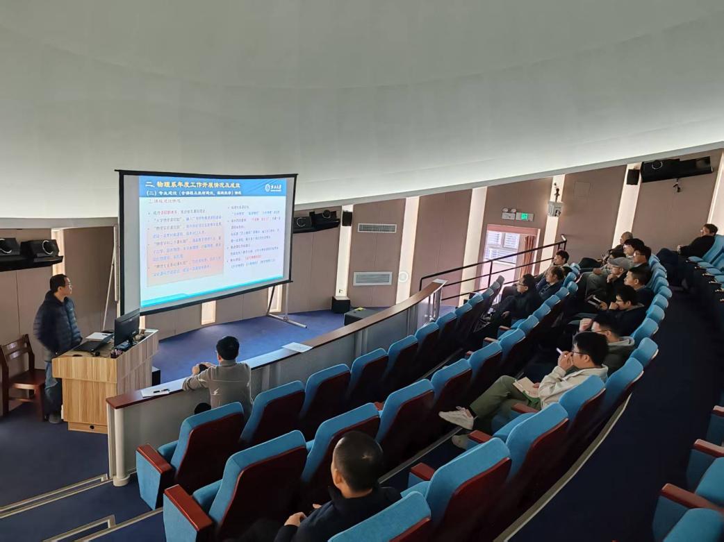 2025 年 1 月 11 日下午,浦京官网物理系召开全系教师工作会。会议主要议题包括导师制课程、本科毕业设计(论文)的工作管理,以及2024年物理系教学工作总结与2025年工作安排。会议由系主任梁毅主持,副院长林达斌出席,全系老师参加会议。